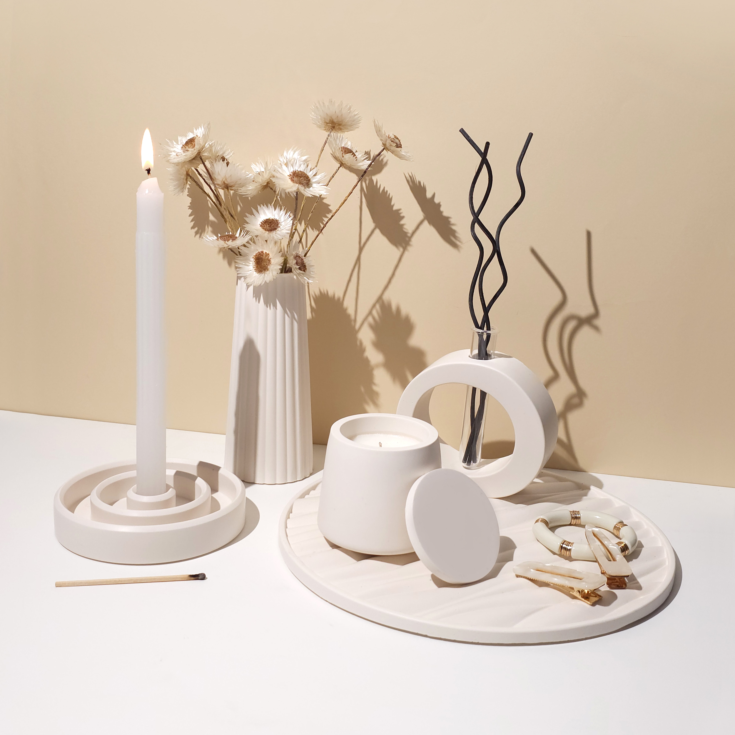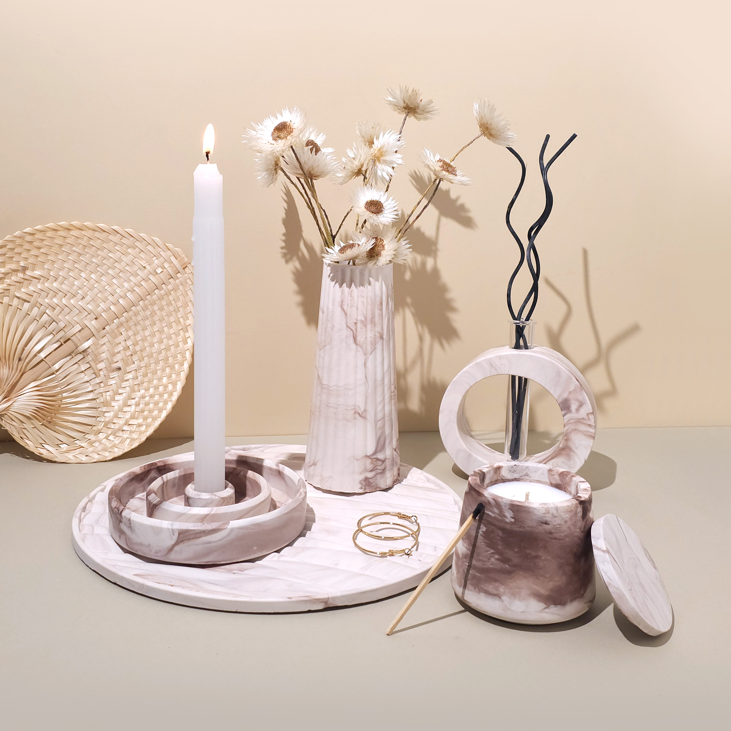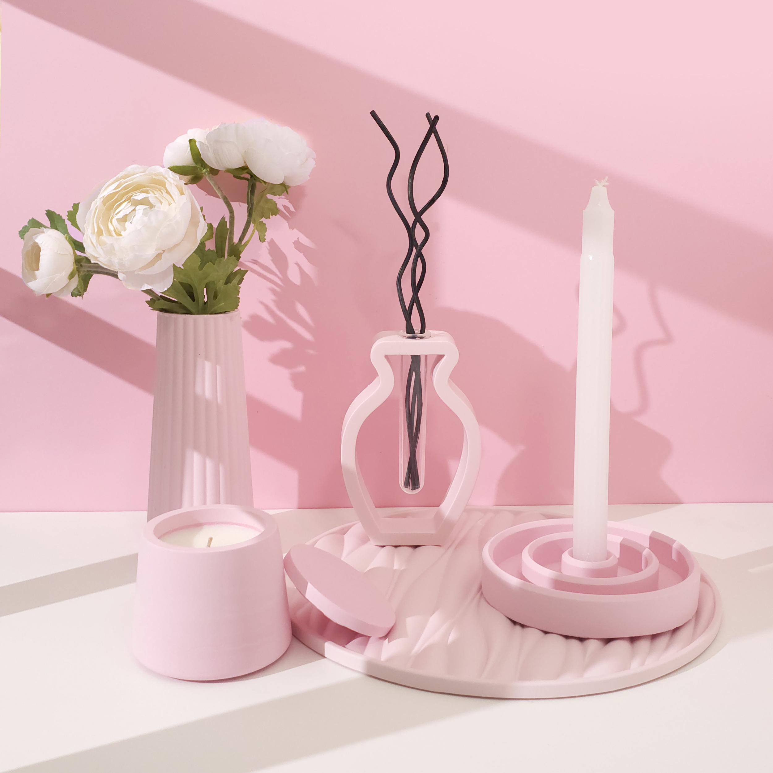 candle holder, vase, diffuser, tray and candle. Soft, soothing, and imaginative — this dreamy collection is designed to bring a sense of wonder and restfulness to your space.